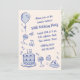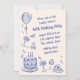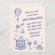 Esta encantadora invitación azul para la fiesta de cumpleaños incluye íconos de cumpleaños en un estilo caprichoso, garabato, que incluye un globo, vasos de bebida, torta de cumpleaños, cerezas, cinta, pastelitos y rebanada de torta. Aquí se muestra como una invitación para una fiesta de cumpleaños número 30, pero puedes cambiarla a cualquier año. Los colores de los ilustraciones, el texto y el fondo se pueden cambiar fácilmente.