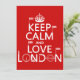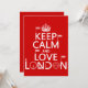 Esto dice Keep Calm and Love London, en el estilo clásico mantener la calma poster. Hay banderas sindicales ondeando en las cartas. Adicionalmente, la palabra Londres está compuesta por famosos monumentos, incluyendo la rueda del milenio, el letrero de los tubos, el autobús londinense y el bén grande. Es un diseño divertido, que atrae la vista y levanta una sonrisa. Ideal para todo anglófilo, turista o local.