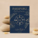 Moderna y elegante invitación de cumpleaños con mapa mundial de destino, como pasaporte, para cualquier edad