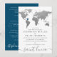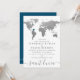Invitación de boda temática de viaje con mapa mundial en azul y plata con ubicación de corazón móvil y tipografía elegante y chic.