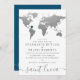 Invitación de boda con tema de viaje por mapa mundial azul y plata con ubicación de corazón móvil y tipografía elegante y chic.