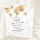 ¿Planeando tu boda en un destino romántico? Invita a tus invitados con esta hermosa invitación con mapa mundial dorado y tu destino personalizado marcado con el corazón móvil.