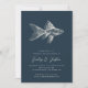Nuestras invitaciones a la fiesta de compromiso de la moda costera incluyen un ilustracion de pescado de estilo vintage de color blanco cremoso sobre un fondo azul marino. Personalice con los detalles de su parte de compromiso debajo.