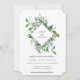Elegante marco en forma de diamante con acuarela botánica, invitación de boda. Delicadas y aéreas hojas y ramas botánicas en verde salvia con flores blancas suaves. La parte trasera de la tarjeta presenta un color dusty sage sólido.