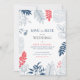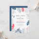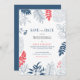 Marco de flores y hojas tropicales en azul marino con un marco coral-rojo, plantilla de invitación de Save the date personalizable.