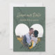 Diseño moderno y colorido de guardar la fecha en verde bosque con marco de foto en forma de corazón, texto personalizado y colores de fondo. Contacte con el diseñador para consultas de diseño