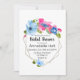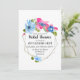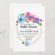 Un impresionante ramo de flores azules claras, rosas calientes y azules oscuras adorna esta invitación moderna para una ducha de novia.