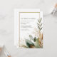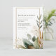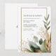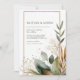 Invite a sus invitados con un sentido de elegancia natural y discreta utilizando esta invitación de boda rústica minimalista. El diseño está anclado por un fondo blanco vertical limpio, maximizando la simplicidad y el enfoque en los elementos naturales. Un delgado marco rectangular de brillo dorado falso proporciona un límite elegante y chic para su texto. El punto culminante del diseño es la vegetación de acuarela, concentrada principalmente en la esquina inferior y que se extiende hacia arriba por un lado. El follaje presenta una hermosa paleta de colores suaves, que van desde hojas de verde salvia polvoriento y tonos de eucalipto profundo hasta acentos cálidos de terracota y naranja quemada, lo que sugiere un tema otoñal o bohemio. Delicados ramitos botánicos dorados y puntos de salpicaduras de pintura verde añaden textura y brillo a la composición natural. Este estilo de jardín boho es perfecto para parejas que planean una ceremonia al aire libre, una boda en un granero rústico o cualquier evento que abrace la sofisticación terrenal y orgánica. Este diseño es perfecto para invitaciones de boda rústicas, anuncios de lluvia de novia bohemios, invitaciones a eventos otoñales terrenales o papelería elegante para la cena de ensayo. Este hermoso diseño también se puede adaptar fácilmente para su uso como anuncios de eventos corpor