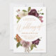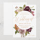 Elegante caligrafía de color dorado con hermosas flores de color rosa frambuesa oscuro y una sólida invitación a la boda en la espalda blanca.