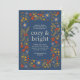 Un marco rústico y encantador de flores ilustradas rodea esta cálida y acogedora invitación a la fiesta de otoño con colores de azul marino intenso, rojo oxidado y amarillo dorado. Perfecto para una reunión de otoño con amigos, cumpleaños de adultos o incluso comida de Acción de Gracias, el texto fácil de editar te da muchas opciones de personalización.