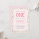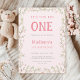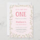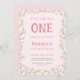 Esta invitación para el primer cumpleaños incluye un marco floral de flores rosas y verdes adornado con mariposas.
