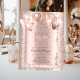 Elegante corona purpurina, globos y marco sobre el fondo oro rosa.