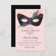 Invitación del partido temático Mardi Gras para cualquier ocasión; texto editable con máscaras decoradas con plumas verdes moradas y doradas; todo el texto es editable para tu evento.