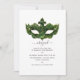 Tarjeta de invitación de cumpleaños con temática mardi gras de color agua.