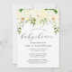 Una hermosa disposición floral de marfil y nata hidrangeas, rosas y peonías de color nata con vegetación aparece encima de las palabras "baby ducha" en elegante escritura de escritura a mano gris carbón vegetal. Personalizar el resto del texto con el nombre de la futura madre, fecha, lugar y detalles de RSVP. Ideal para una ducha de primavera o verano.