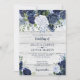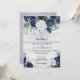 Una elegante invitación con detalles bodas rodeados de hermosas flores en tonos azules, blancos y ricos de marina sobre un fondo rústico de madera blanca. Puede agregar su propio mensaje especial y cambiar el estilo de letra yendo al menú personalizar. Esta invitación forma parte de una hermosa suite boda que puede ser totalmente personalizada.