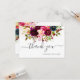 Tarjeta plana de agradecimiento, Rustic Boho Watercolor Rubor Marsala Rojo y Navy Blue Peonies colgando ramos de eucalipto azul. Esta tarjeta está acentuada con un moderno guión escrito a mano, gracias. Copyright © 2016-2020 Bombino Designs™.