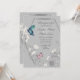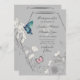 Esta invitación geométrica a la boda floral incluye dos hermosas mariposas, un azul dramático y un rosa bonito. Están encaramadas sobre un elegante arreglo floral que está bellamente entrelazado con un hexágono gris oscuro. La invitación se hace en tonos grises, beige, azul y rosa.