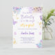Adorables invitaciones capilares para chicas a la ducha de mariposas. Mariposas vibrantes en colores pastel como lavanda, púrpura y rosa claro.