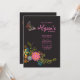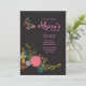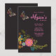 Una encantadora invitación con una mariposa caprichosa y un ramo de fantásticas flores de colores sobre un fondo negro. Muy adecuada para mujeres de cualquier edad.