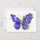 Joyería, azul, zafiro, mariposa de flor brillante con ala decorada con flores azules, preciosas flores con hojas doradas sobre fondo blanco.