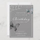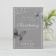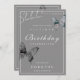Una bonita y moderna y sorprendente invitación para el cumpleaños de un adulto en gris con una mariposa pintada a mano que contiene un patrón de rosa floral. Personalizable para cualquier hito de cumpleaños