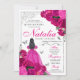 Invitación de cumpleaños a la Quinceanera floral rosa y plateada de Fuchsia