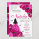 Invitación de cumpleaños a la Quinceanera floral rosa y plateada de Fuchsia