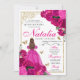 Invitación de cumpleaños a la Quinceanera floral rosa y dorada de Fuchsia