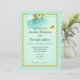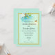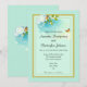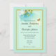 Una elegante invitación de boda con tema de naturaleza. Un fondo abstracto con círculos y formas en espiral. El color es un verde veraniego calmante, turquesa y amarillo en colores pastel claros. Un par de mariposas naranjas y amarillas revoloteando alrededor de delicadas flores en flor con hojas verdes y ramas marrones. Tiene un aspecto delicioso y mágico. Una superposición transparente con borde dorado en el centro muestra toda la información de su boda. El fondo es verde menta.