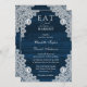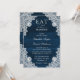 Complemente su rústico campo azul marino, o fiesta de bodas en el granero con estas elegantes invitaciones rústicas de boda con encaje floral blanco sobre un fondo rústico de madera azul marino. Artículos de juego disponibles para ir con estas invitaciones de boda rústicas de moda azul marino.