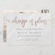 ¡Uy! Las circunstancias imprevistas son difíciles de planificar, pero con estas tarjetas de aplazamiento de boda puedes informar fácilmente a tus seres queridos. Con un fondo de mármol blanco. Las palabras "cambio de planes" aparecen en la parte superior en una escritura de falso foil de oro rosa con dulces remolinos. En el reverso hay una plantilla de foto para que la reemplaces con la tuya. ¡Haz clic en "Personalizar esta plantilla" y comienza a agregar tus propios detalles!