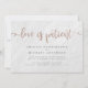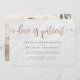 ¡Uy! Las circunstancias imprevistas son difíciles de planificar, pero con estas tarjetas de aplazamiento de boda puedes informar fácilmente a tus seres queridos. Cuenta con un fondo de mármol blanco. Las palabras "el amor es paciente" aparecen en la parte superior en una tipografía de falso foil de oro rosa con dulces florituras. En el reverso hay una plantilla de foto para que la reemplaces con la tuya. ¡Haz clic en "Personalizar esta plantilla" y comienza a agregar tus propios detalles!