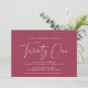 Invitaciones modernas de 21 años con "veintiuno" en un guión escrito a mano. Diseño simple, de sólo texto con fuente blanca sobre fondo rojo.