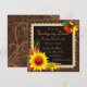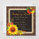 Elegante invitación de cosecha con girasoles, trigo, bellotas, hojas, champiñones, bayas y un pájaro. Puesta en un fondo marrón chocolate con trabajo de pergamino marrón claro.