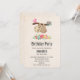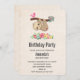 Invitación a una fiesta de cumpleaños con un ilustracion con un lindo perezoso marrón colgando boca abajo. Este pequeño y gracioso se aferra a una rama que tiene un pequeño pájaro rosado a un lado de la rama y un ramo de rosas al estilo de doodle al otro lado. Debajo de ellos hay un arreglo de flores pintadas a mano de colores. Este adorable perezoso también tiene mejillas rosadas y 3 lindos corazoncitos en el trasero.