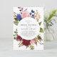 Una encantadora invitación rústica a la ducha de novias con un texto en círculo blanco rodeado de un ramo acuarela floral en tonos marsala o burdeos, azul marino y rosa. El otro lado es el de marsala a la sombra.