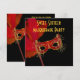Invitaciones de cumpleaños de máscara de plumas rojas y doradas para fiesta de disfraces Sweet sixteen. Personalice con los detalles de su fiesta, estilo de fuente y fuente dolor.