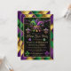Elegante diseño de la Mascarada de Oro, Púrpura y Verde Mardi Gras con gorra de carnaval, luces de bokeh y diamantes con un fondo abstracto.