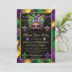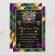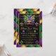 Elegante diseño de la Mascarada de Oro, Púrpura y Verde Mardi Gras con máscara de carnaval, luces de bokeh y diamantes con un fondo abstracto.
