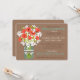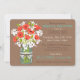 Frasco de albañil envuelto de encaje lleno de espías coralinas y flores silvestres sobre diseño de tarjeta de invitación a la ducha de novia con aspecto de burlap.