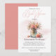 Esta invitación a la ducha de novias presenta una estética suave y romántica con un fondo acuático y un delicado ramo de flores rosas y melocotones colocadas en un frasco de albañil atado con una cinta. El diseño combina elegancia con encanto rústico, perfecto para una celebración sentida. El diseño de texto utiliza una mezcla elegante de tipos de letra: cursiva fluida para el título del evento y el nombre de honoree, emparejada con tipos de letra serif clásicos para los detalles, creando una jerarquía visual equilibrada y refinada. La composición general se siente cálida, festiva y cuidadosamente compuesta.