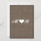 Modelo rústico de invitación a matrimonio Mason Jar Burlap con flores de lavanda morada en un frasco enlatado con encaje con las iniciales de la novia y el novio con un corazón en la parte superior. Estas invitaciones caseras únicas son perfectas para cualquier boda de temática rústica. Las iniciales de la pareja y el corazón también están detrás de la invitación sobre el rústico y afligido fondo de diseño de burpón impreso. tarro de albañil, tarro de lata, encaje, rústico, campestre, angustiado, viejo, antiguo, vintage, boda de granero, lavanda púrpura, iniciales, invitaciones a bodas con jarros de albañil, iniciales de novia y novio. vuelta, aspecto de burlap, burlap falso, diseño de burlap impreso
