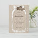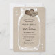 Invitación a una boda rústica con un frasco de albañil y corazones de arpillera sobre un fondo de burrega. Personaliza fácilmente esta invitación a bodas con jarros de albañil con los detalles de tu boda.