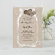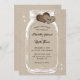 Invitación a una boda rústica y personalizado con tarro de albañil con frascos de carnicero y corazones de arpillera con iniciales en un fondo ligero de arpillera. Personalice fácilmente esta carta boda rústica con los detalles de su boda.