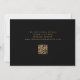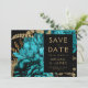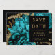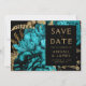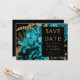 Esta elegante boda monacal Save the Date cuenta con un exuberante y romántico ramo floral de color turquesa con un Relieve metalizado de imitación dorada y follaje purpurina sobre un fondo negro. Personalizar el texto de color dorado en fuentes elegantes en un rectángulo negro, y agrega un breve texto adicional al dorso, junto con un código QR para ayudar a tus invitados a visitar el sitio web de tu boda.