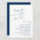 Tarjeta de invitación a la celebración de la salida del boda (felizmente siempre después del almuerzo), con temática romántica de estilo azul marino con escritura moderna. Es perfecto para su fiesta de recepción de boda/celebración post boda. Añade tus detalles.