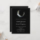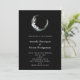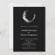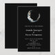 Una invitación de boda con una ilustración mística. Una luna creciente azul oscuro con un contorno circular delgado y elegante y flores blancas a lo largo de sus bordes.