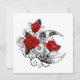Contorno, luna de media luna mecánica con engranajes, decorada con rosas rojas con tallo negro y hojas sobre fondo blanco. Steampunk