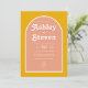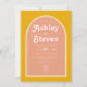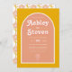 Esta invitación a la boda se inspira en la estética vibrante y nostálgica de los años 70, con tonos rosa melocotón y amarillo mostaza retro. Capta la esencia de la época de los años setenta con su paleta de colores retro y su estilo general. En la parte delantera encontrarás un diseño de arco acompañado de tu texto personalizado, mientras que en la parte trasera se muestra un patrón de flor retro junto con una foto de la pareja.